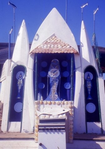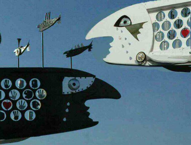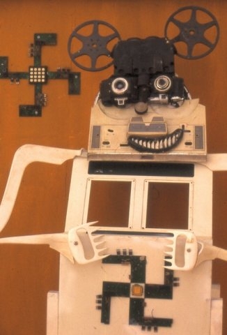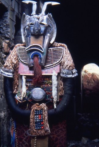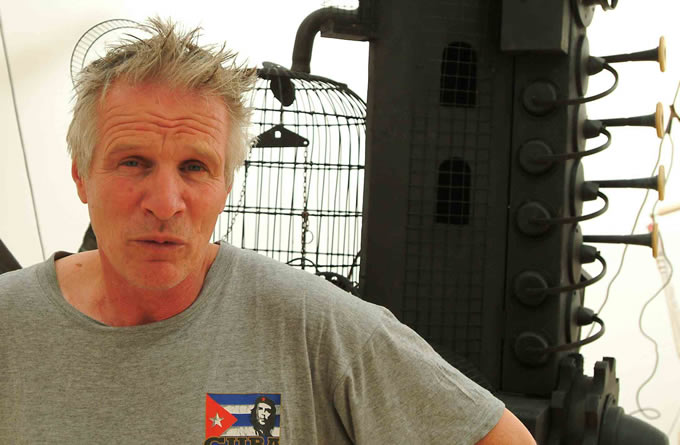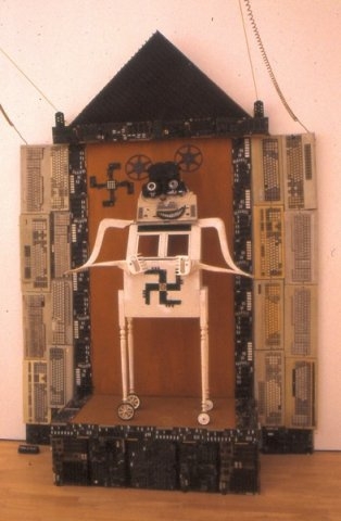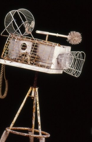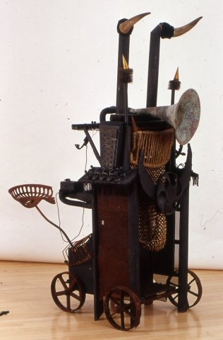 The artist David Kemp lives and works on the far western coast of Cornwall, among the old mine workings near Botallack. He finds material for his work in rich seams of junk, appearing here and there at boot fairs, but adding up, in the imagination, to something like that mysterious productive heap of dust in Dickens’ Our Mutual Friend. In fact there is an almost Dickensian breadth of vision, richness of character and sharpness of observation in Kemp’s work. David Kemp’s work is serious fun: serious, because his intention is to tackle our folly and or materialist excesses and fun because he is a master of life-enhancing humour. Driven by his own apocalyptic and subversive vision, he makes sculpture from the disregarded bits and pieces left by successive consumer boom. These remains point out the awful truth – that we value trash and are seduced again and again by the trumped-up new. Technology that is phoney, or only half understood, is grasped at for answers to our needs. In pursuit of the largest thing, it becomes impossible to tell real technological advances from the dead-ends. This point is made for this exhibition particularly by reference to electricity. The rush to harness the power of frog’s legs, to make hair stand on end or capture lightning were all so far beside the point – of course we know now, but in Kemp’s alternative world they have a different and more telling relevance. By making what might have been, or should have been, invented he mirrors universal human weaknes.